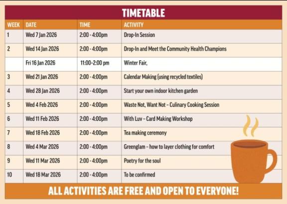 Everyone is invited to enjoy a cosy space with free activities, gentle guidance, and signposting to winter‑wellness services. Whether you’re looking for friendly conversation, wellbeing information, or simply a warm place to relax, our doors are open.